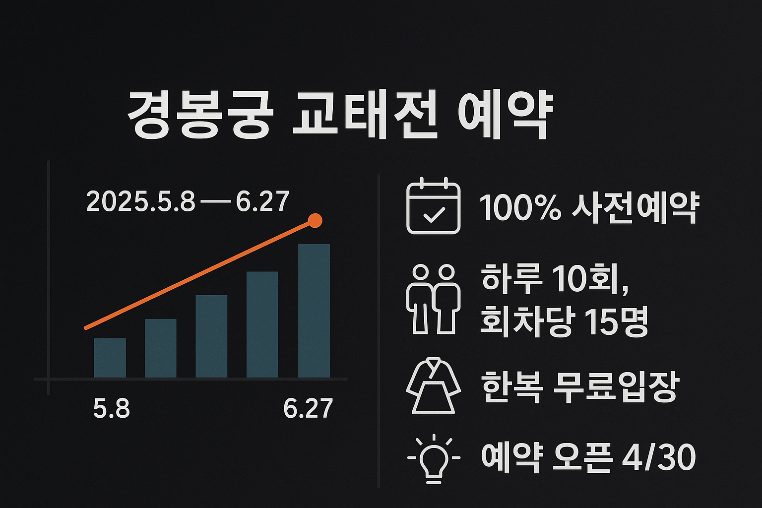 - 예약 일정: 특별개방 기간(2025년 5월 8일~6월 27일, 매주 수·목·금요일) 관람은 완전 사전예약제로 진행됩니다. 예매는 2025년 4월 30일(수) 오후 2시부터 궁능유적본부(문화재청) 누리집 통합예약 시스템에서 시작됩니다.