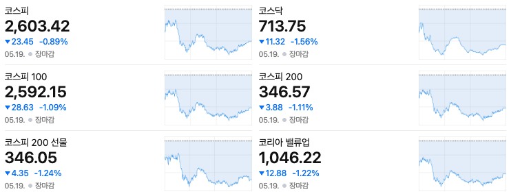 코스피·코스닥 지수 (2025.05.19 장마감 기준). 코스피는 전일 대비 -0.89% 하락한 2,603.42에 마감하며 2,600선을 소폭 밑돌았습니다. 코스닥도 -1.56% 급락해 713.75로 내려앉았습니다.