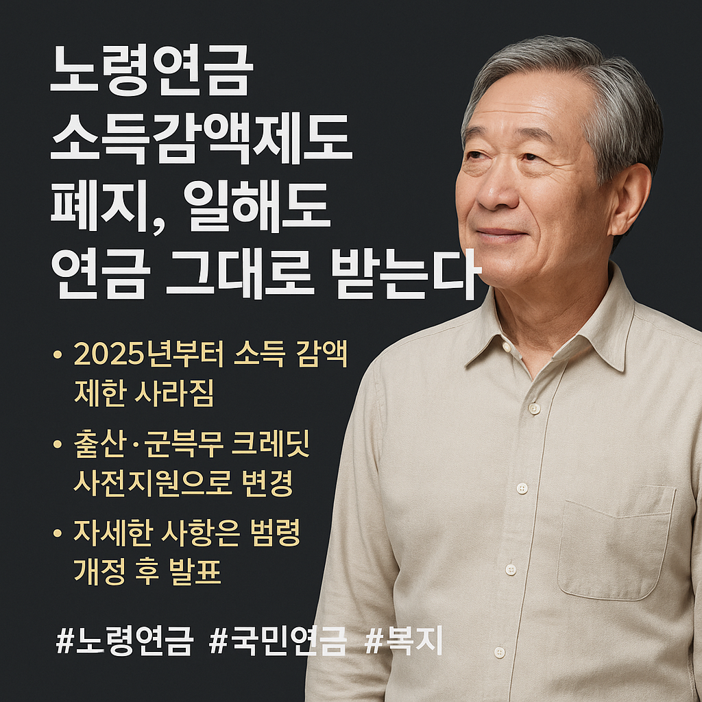 노령연금 소득감액제도 폐지는 은퇴 후에도 활발하게 경제활동을 하는 시니어들에게 희소식입니다. 월 500만원까지 소득이 있어도 연금이 깎이지 않고, 출산과 군복무 크레딧 제도도 개선되어 더 많은 사람들이 안정적인 노후를 준비할 수 있게 되었습니다.