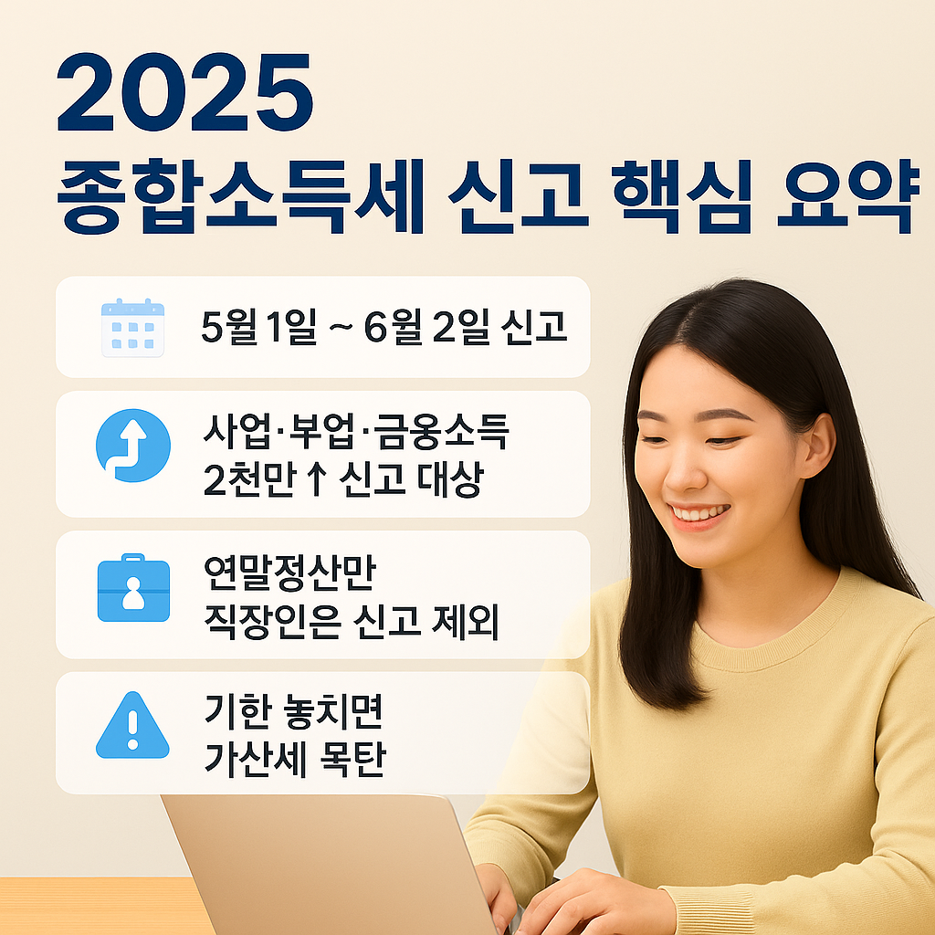 5월은 종합소득세 신고 시즌입니다. 매년 이맘때가 되면 "나는 종합소득세 신고 대상일까, 아니면 회사 연말정산으로 끝난 걸까?" 하고 헷갈려하는 분들이 많죠. 특히 요즘은 프리랜서나 부업으로 추가 소득을 올리는 N잡러 분들도 많아서 고민이 더 큰데요. 걱정 마세요! 오늘 포스팅에서는 2025년 기준 종합소득세 신고 대상자가 누구인지, 그리고 어떤 경우에 신고를 안 해도 되는지 알기 쉽게 설명해드리겠습니다. 중요한 개념은 하나씩 짚어가며, 중간중간 여러분께 질문도 던져볼게요. 또한 신고 대상인데 신고를 놓치면 가산세 등의 불이익이 있으니, 내 경우를 확실히 체크해보세요!