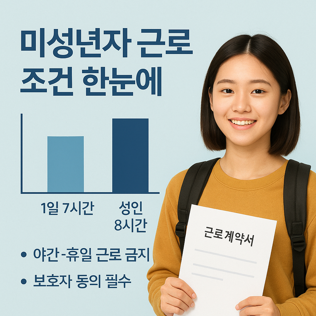 지금까지 미성년자 근로조건에 대해 살펴보았습니다. 핵심 내용은 ▶ *만 15세 이상(중학생 제외)*부터 일할 수 있고, ▶ 하루 7시간·주 35시간까지만 근무하며, ▶ 오후 10시~오전 6시와 휴일 근로는 법으로 금지된다는 점입니다. 또 ▶ 근로계약 시 부모 동의가 필수이며, ▶ 청소년유해업소에서는 근무 자체가 금지된다는 사실도 함께 기억하세요. 이 모든 정보는 안전한 근로를 위한 최소한의 조건들입니다.
