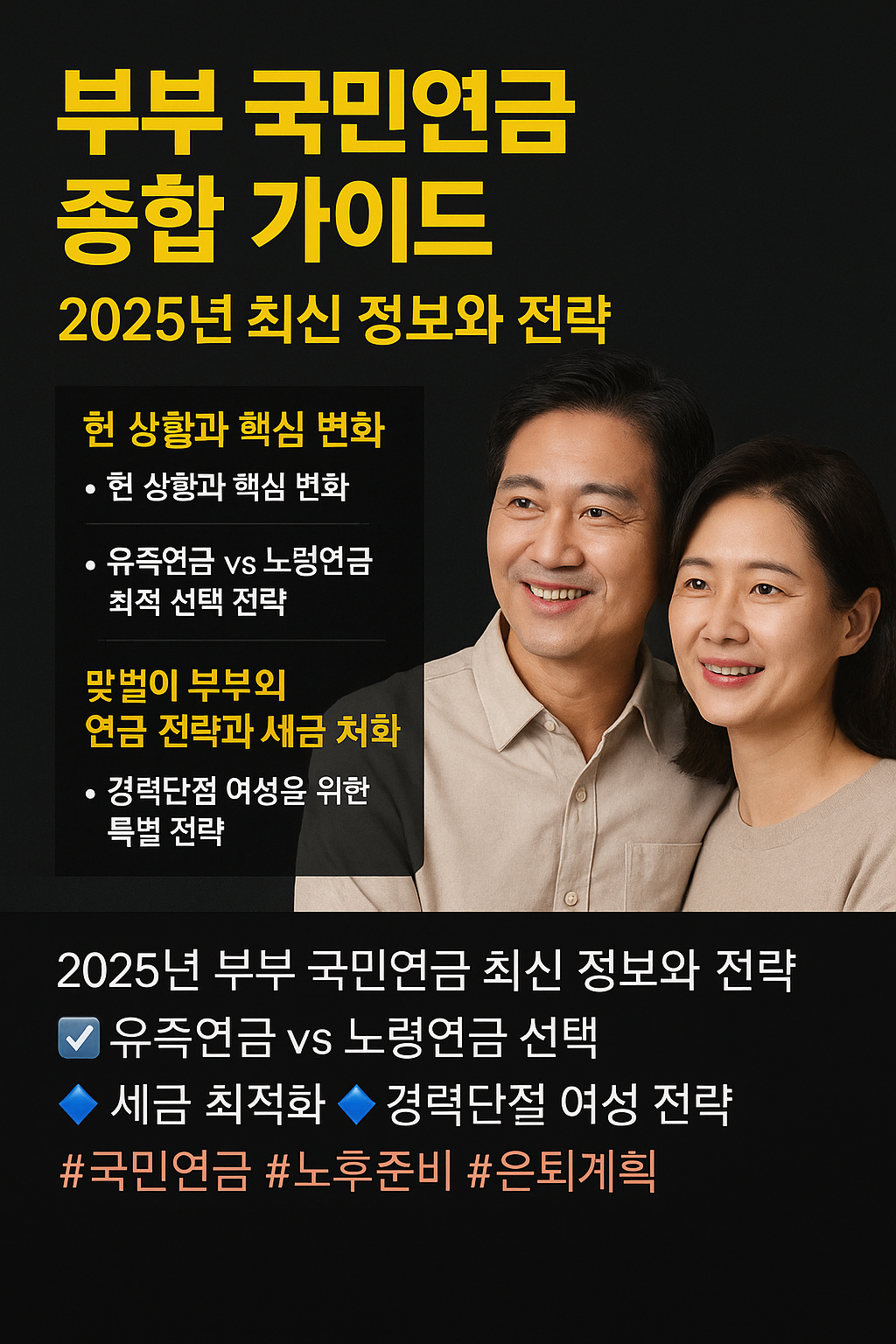 부부 국민연금 수령 전략부터 유족연금 선택, 경력단절 여성을 위한 임의가입과 추후납부제도까지. 2025년 연금개혁과 함께 맞벌이 부부의 노후를 안정적으로 준비하는 실전 가이드를 제공합니다.