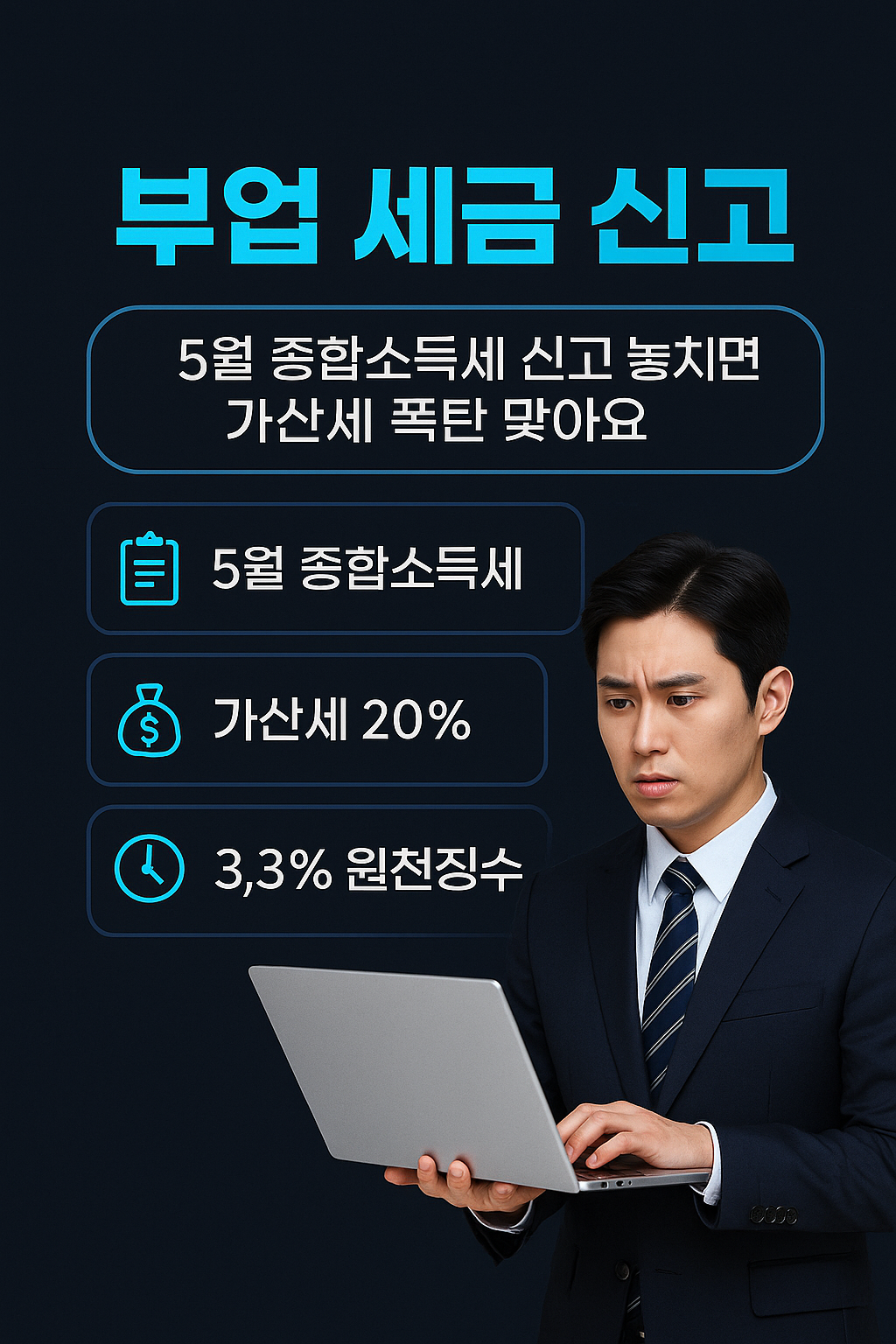 • 신고 방법: 근로소득과 사업소득을 합산하여 5월에 종합소득세 신고를 해야 합니다. 사업소득 신고부업 세금 신고의 가장 대표적인 유형입니다.