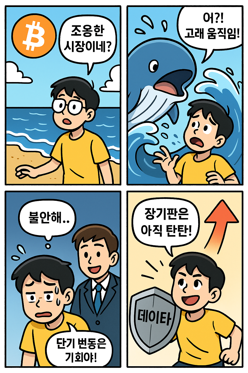| 6월 9일 코인시장, 웃으며 달리되 과열 주의! – 4컷 만화로 보는 오늘의 핵심 시황 (2) | 2025.06.09 |