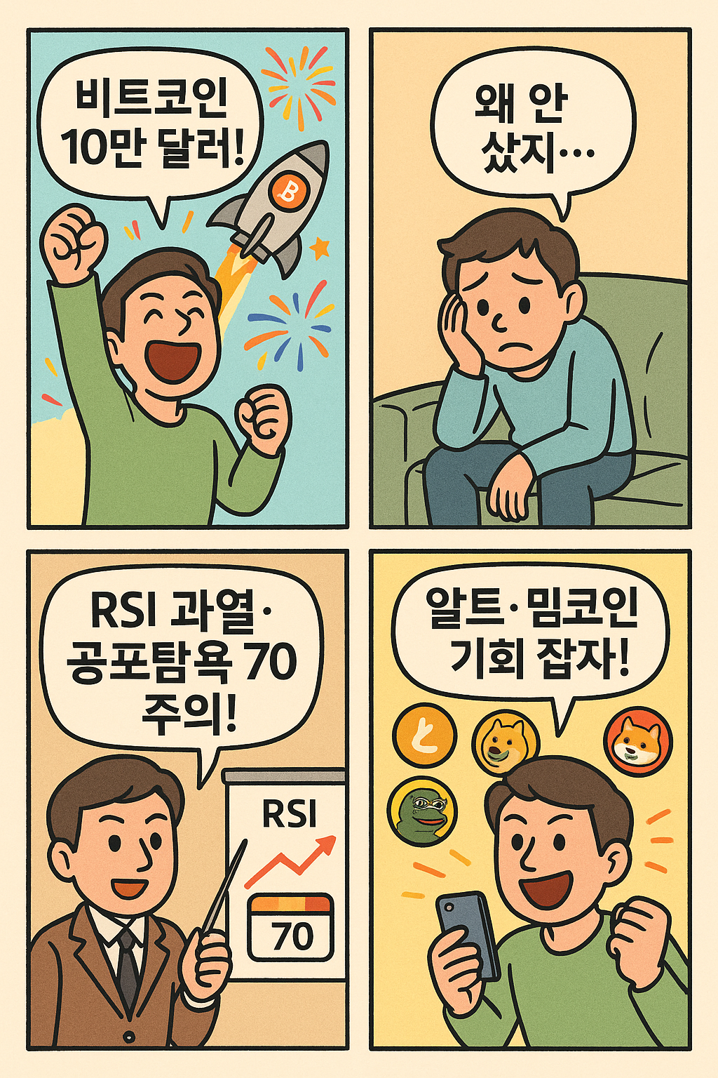 하지만 기쁨도 잠시—“왜 안 샀지…” 하고 가슴을 치는 투자자부터, RSI 과열과 공포 · 탐욕 지수를 경계하는 분석가, 그리고 알트·밈코인 기회를 노리는 ‘손 빠른’ 트레이더까지!