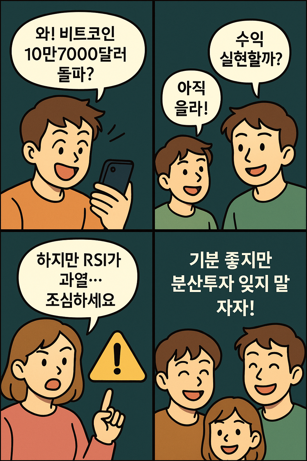 오늘은 비트코인(BTC)이 10만 7000달러(약 1억 5000만 원) 고지를 눈앞에 두고 있는 뜨거운 시장 상황을 희화(ユ humor) 4컷 만화로 풀어봤습니다. 짧지만 핵심을 콕 집어낸 만화를 함께 보시면서, 과열 국면에서 우리가 놓치기 쉬운 리스크 관리 포인트를 짚어볼게요.