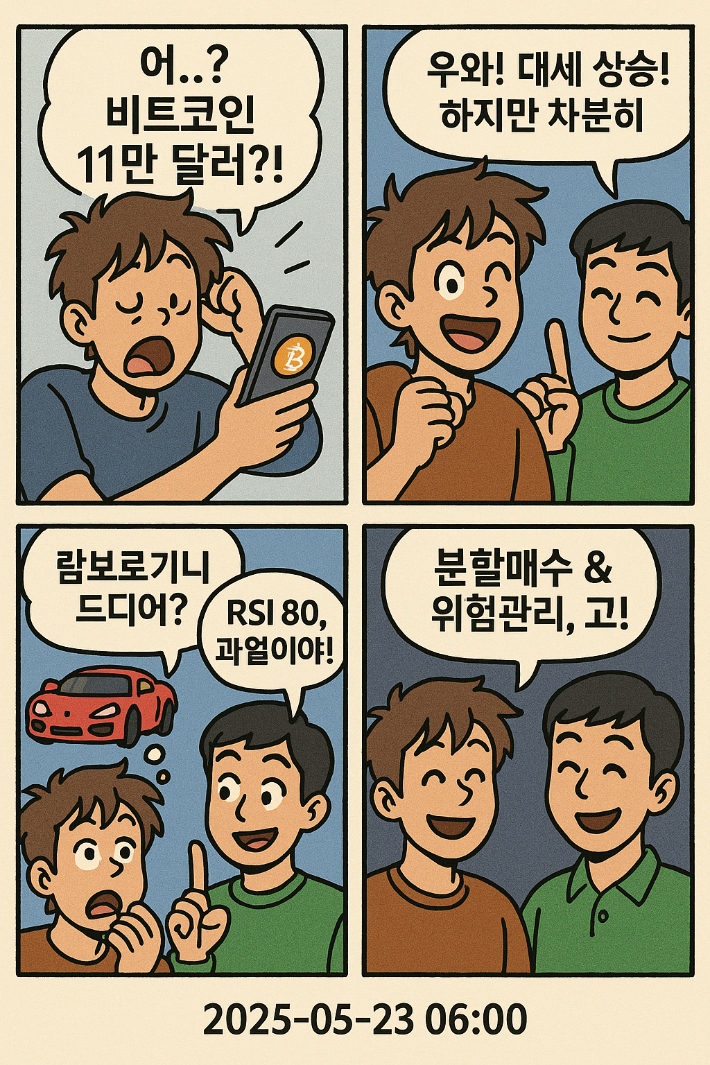 • 3컷 : “람보르기니 드디어?” vs “RSI 80, 과열이야!”—꿈과 현실 사이에서 갈등