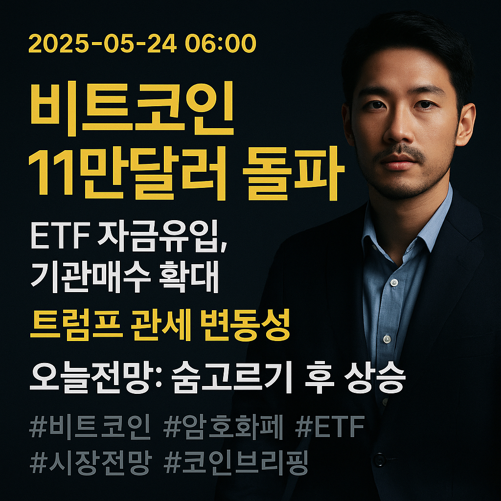 2025년 5월 24일 코인 시장 브리핑: 전일 암호화폐 시장에서는 비트코인이 마침내 11만 달러를 넘어 사상 최고가를 기록하며 강세를 이어갔습니다. 미국 첫 현물 ETF로 대규모 자금이 유입되는 등 호재가 쏟아졌지만, 트럼프 전 대통령의 EU 관세 발언으로 한때 가격이 급락하는 변동성도 나타났습니다. 오늘 새벽 현재 시장은 급등 후 숨 고르기 양상을 보이고 있는데요. 국내외 지표와 뉴스, 기술적/온체인 분석을 통해 오늘의 암호화폐 시장 동향과 전망을 살펴보겠습니다.