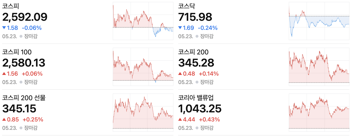 5월 23일 국내 주식 시장에서 코스피는 2,592.09포인트로 전일 대비 -0.06% 소폭 하락했고 코스닥은 715.98로 -0.24% 내렸습니다. 국내 증시는 외국인 수급 부진과 차익실현 매물로 보합권에 머물렀으며, 투자자들은 종일 관망하는 태도를 유지했습니다.