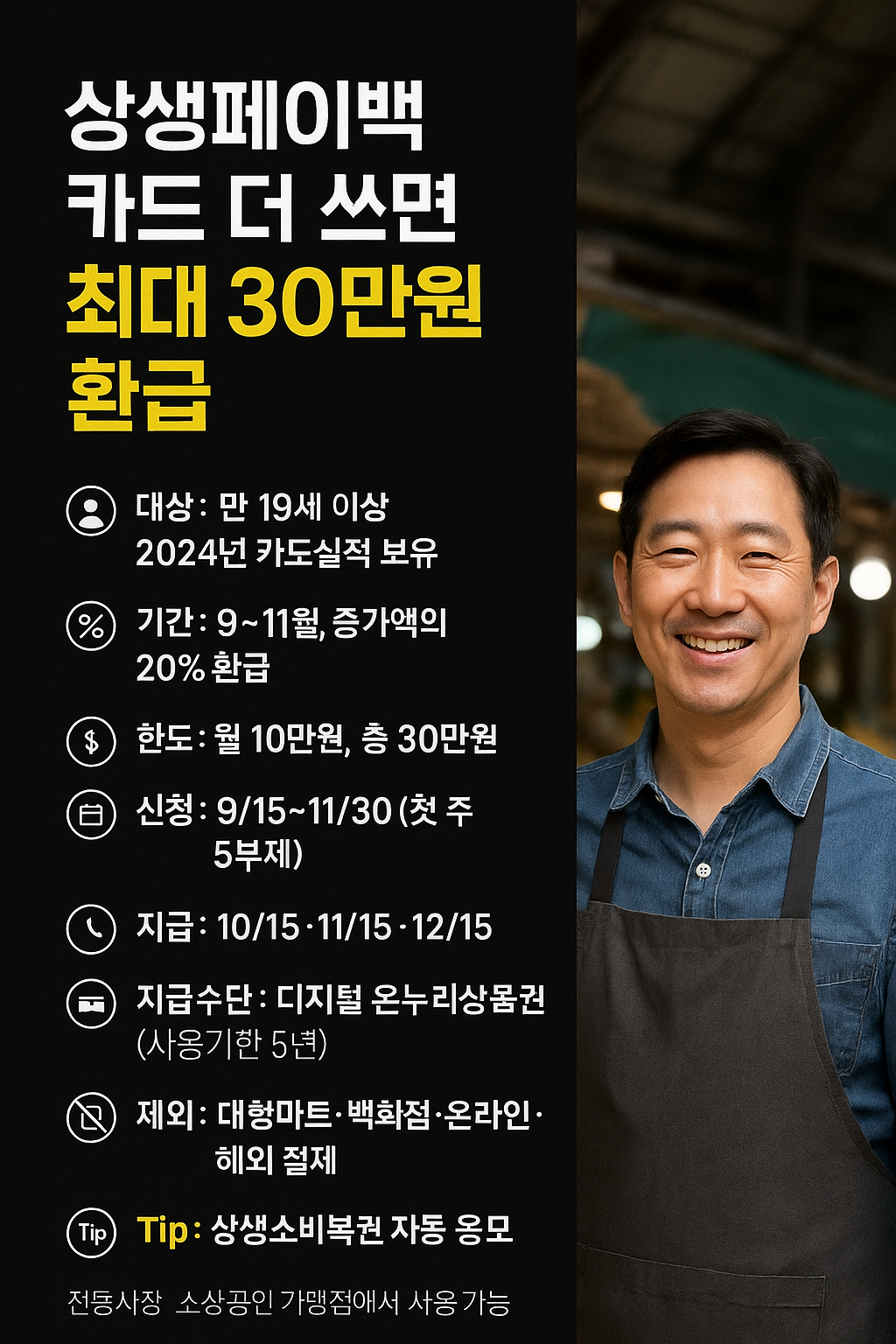 신청은 9월 15일 오전 9시부터 시작됩니다. 상생페이백 전용 사이트에서만 신청할 수 있으며, 11월 30일까지 접수가 가능합니다.