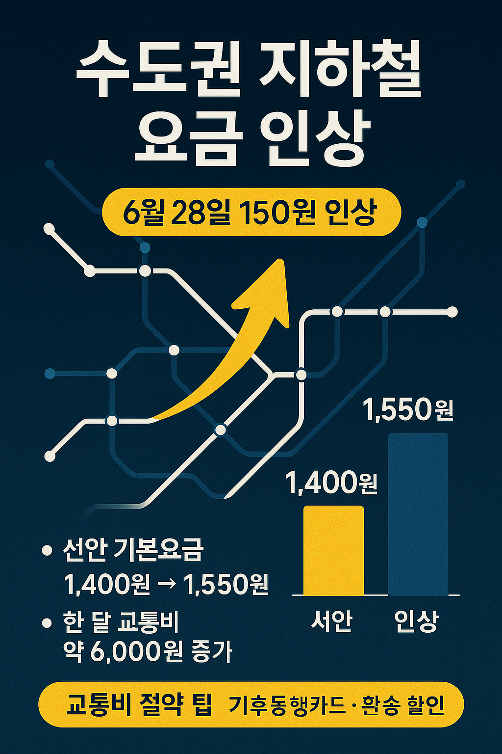 수도권 지하철 요금이 6월 28일부터 150원 인상됩니다. 이는 많은 시민들에게 경제적 부담이 될 수 있지만, 이 글에서 소개해드린 다양한 방법들을 활용한다면 그 부담을 줄일 수 있습니다.