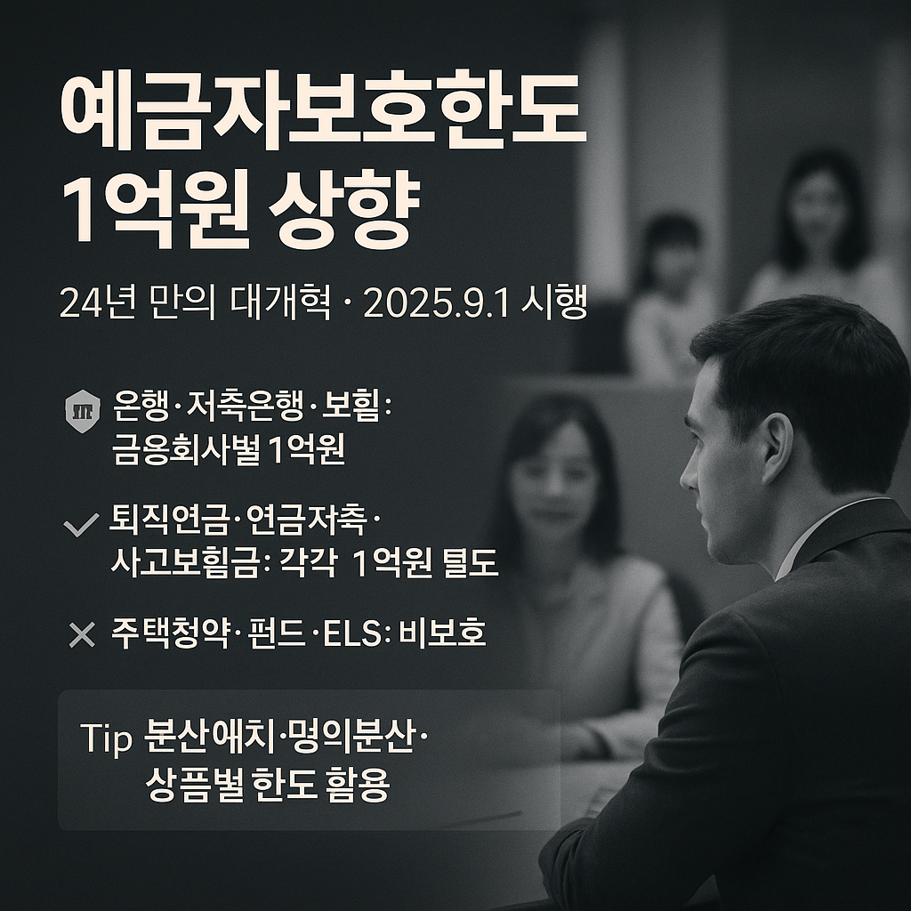 2025년 9월 1일부터 예금자보호한도가 5천만원에서 1억원으로 상향됩니다. 예금자보호제도의 변경사항과 보호대상 금융상품, 예금자보호법 적용범위, 퇴직연금과 연금저축 보호한도까지 상세히 알아봅니다.