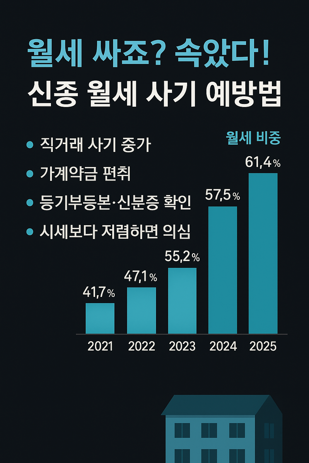 최근 몇 년간 전세 사기 사건이 빈번히 발생하면서, 많은 임차인이 전세 대신 월세로 눈을 돌리고 있습니다. 실제로 국토교통부 주택통계에 따르면 올해 1~2월 전국 전·월세 신규 거래 중 월세 비중이 61.4%로 상승했습니다.
