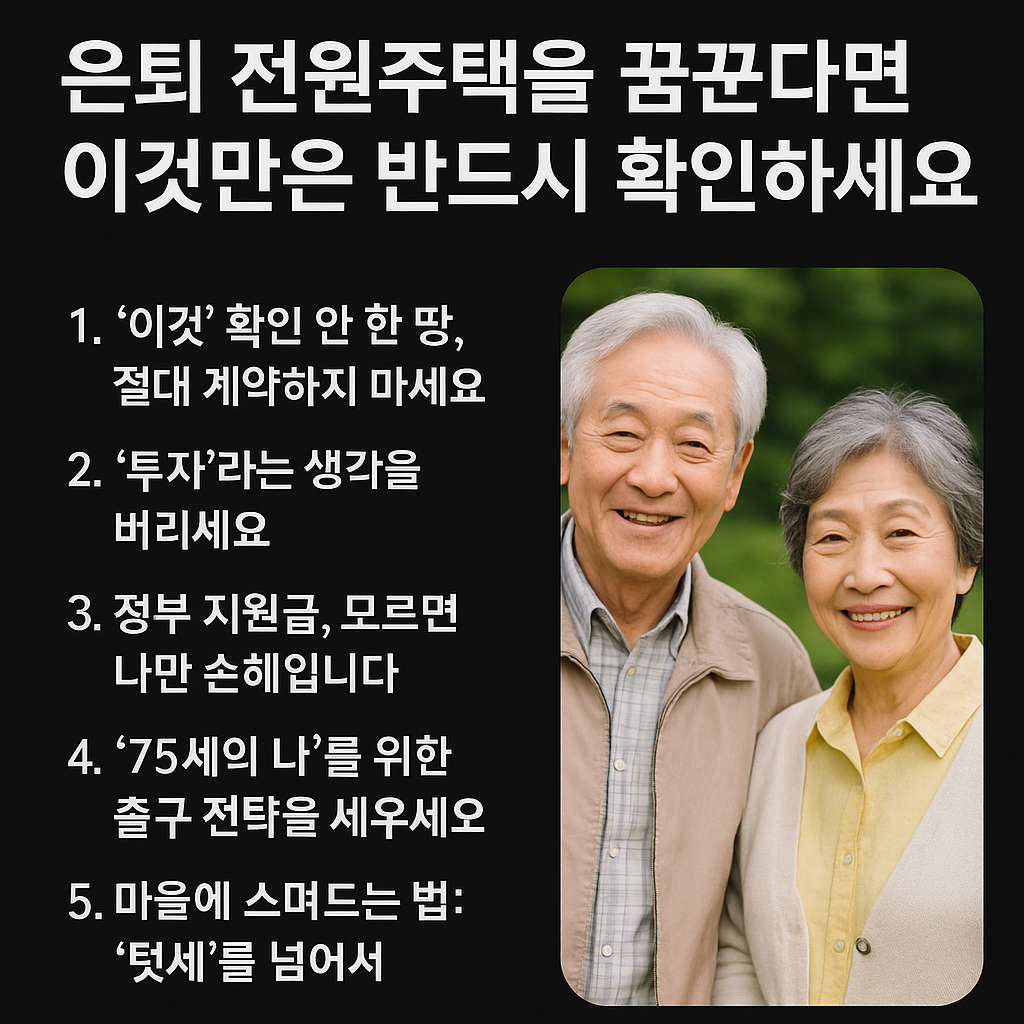 성공적인 은퇴 전원생활은 ‘얼마나 큰 집을 짓는가’가 아니라 ‘어떤 위험을 피하고 어떻게 살아갈 것인가’에 대한 철저한 계획에서 시작됩니다. 집을 짓기 전에 먼저 살아보고, 소유하기 전에 먼저 경험해보는 지혜가 그 어느 때보다 필요한 시점입니다.