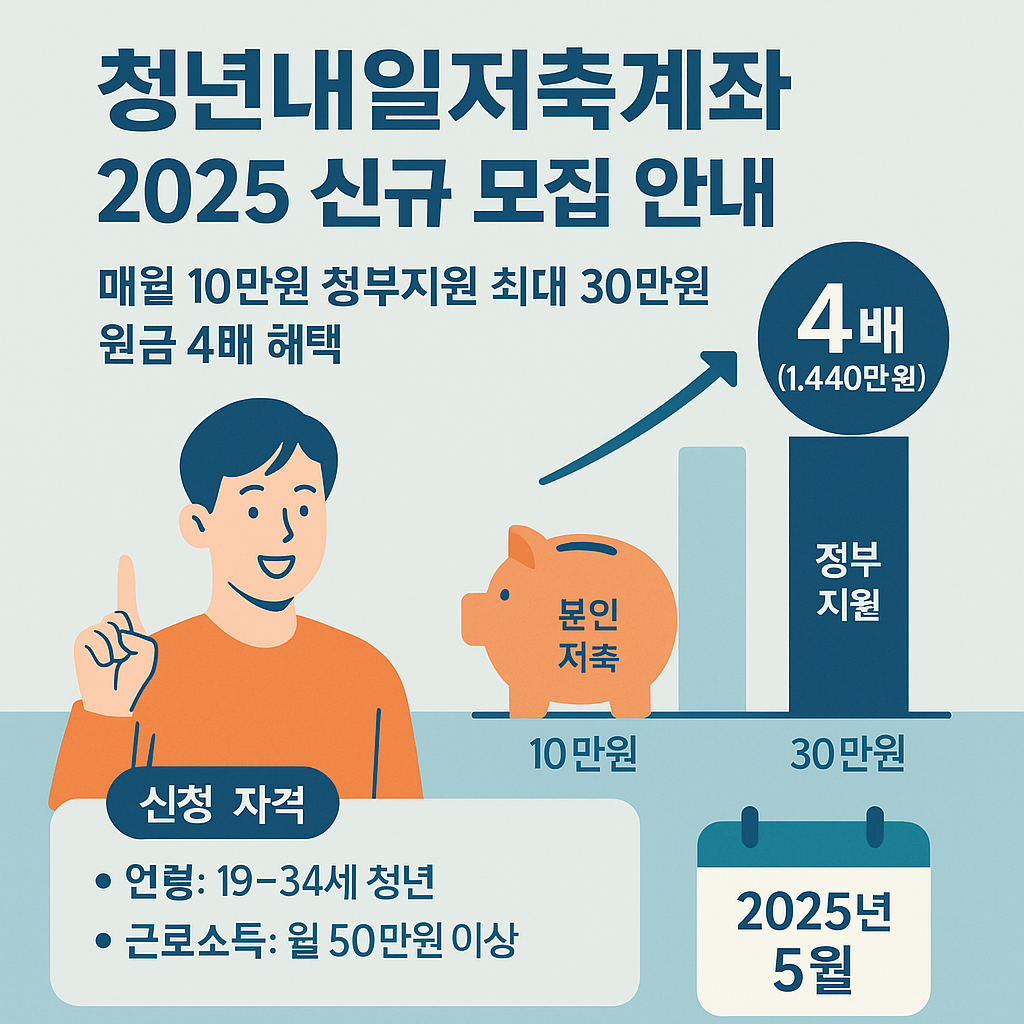 청년내일저축계좌 2025 신규 모집 안 오늘은 청년들의 자산형성을 위한 최고의 기회, '청년내일저축계좌'에 대해 상세히 알아보려고 합니다. 매월 10만원을 저축하면 정부가 최대 30만원을 지원해주는 파격적인 혜택을 제공하는 이 제도, 2025년 5월 모집이 시작되었습니다. 원금의 최대 4배까지 받을 수 있는 이 기회를 놓치지 마세요!