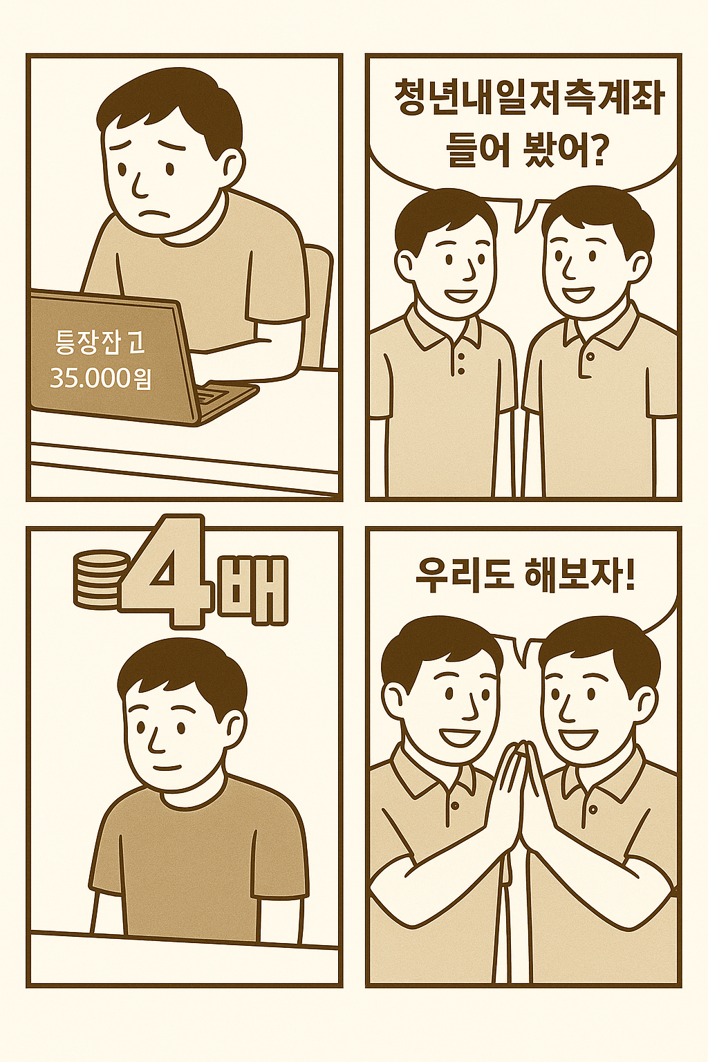 - 2컷: 친구의 한마디 “청년내일저축계좌 들어봤어?”