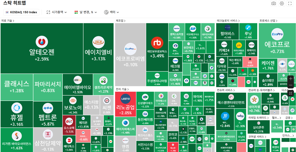 코스닥 시장은 전반적으로 초록색이 우세하여 대부분 업종이 상승했음을 보여준다. 특히 2차전지 소재바이오 제약 섹터의 강세가 두드러졌고, 게임주 일부는 조정 받았다.