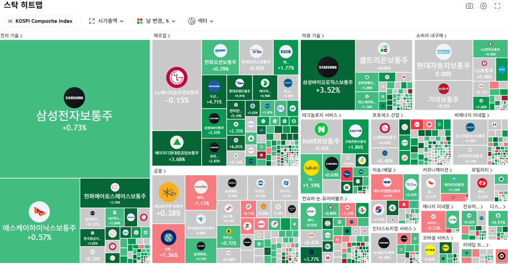 녹색은 주가 상승, 회색은 보합, 빨간색은 하락을 나타낸다. 이 날 삼성전자(+0.73%)와 삼성바이오로직스(+3.52%) 등 대형주 대부분이 상승했고, 자동차주인 현대차는 보합, 기아는 소폭 하락했다.