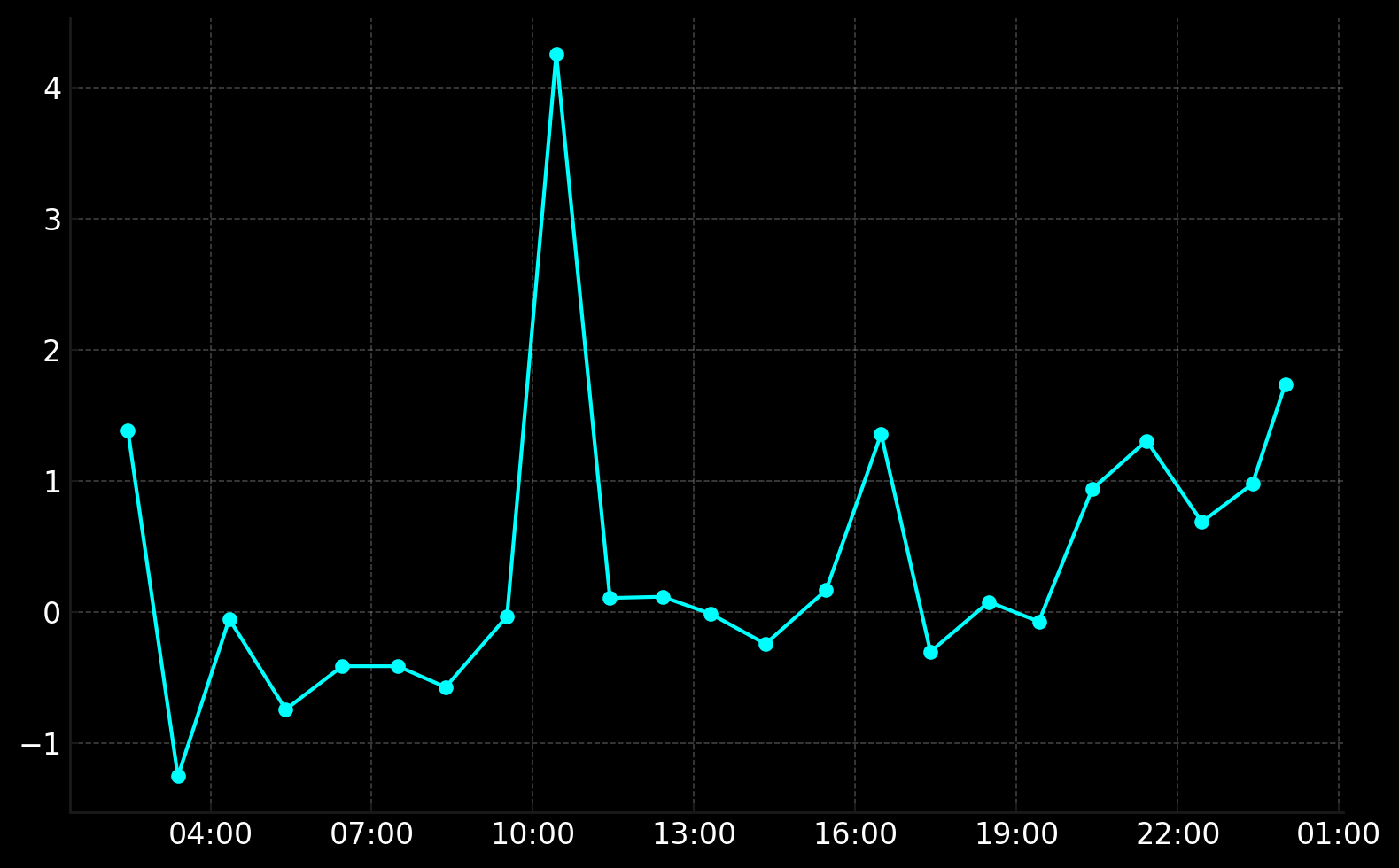 하루 동안의 점수 추이를 보면, 오전에는 -1 안팎의 부정적 기류로 출발했습니다. 이 시기 뉴스에서는 트럼프 대통령의 연준 의장 비판, IMF 전망치 하향 등 부정적 이슈가 우세하여 투자 심리를 위축시켰습니다. 하지만 오전 10시경(현지시간 밤) 트럼프 대통령의 “관세 완화” 신호와 기술주 상승 소식이 전해지자 점수가 급격히 +4.26까지 치솟았습니다. 이는 뉴스 흐름이 순식간에 매수 심리 우위로 돌아섰음을 뜻합니다. 이후 점수는 +1 내외의 약한 긍정권으로 장중 내내 유지되었습니다. 장 후반에도 무역협상 진전 기대, 일부 기업 호실적 뉴스가 이어지며 점수가 +1~+2 수준을 가리켜, 종합적으로 그날 투자 심리는 긍정 쪽에 무게가 실렸습니다.
