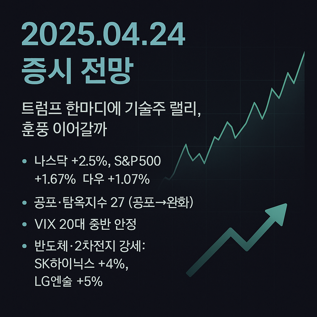 | 2025년 4월 24일 증시 전망: 트럼프 관세 완화 발언에 기술주 랠리, 공포 심리 완화 (5) | 2025.04.24 |