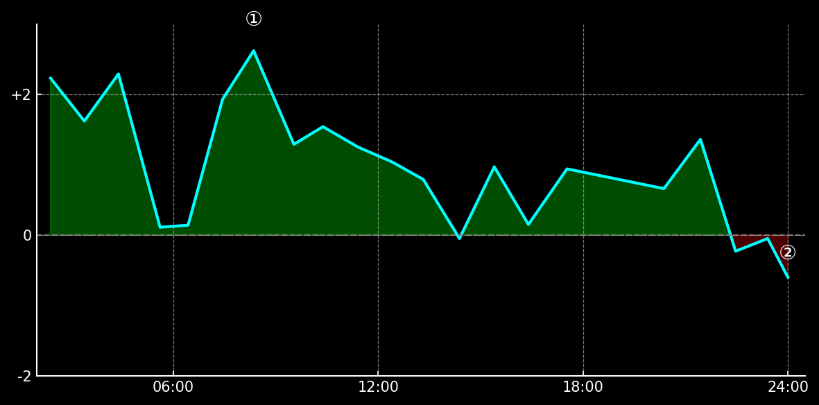 AI 뉴스 알고리즘으로 측정한 매수 추천 점수 추이를 살펴보면, 전일 새벽부터 오전까지 시장 심리가 크게 개선되었다가 오후 들어 다소 주춤한 양상이 뚜렷했습니다. (AI 점수는 -9 ~ +9 범위로, 양수일수록 매수 측 우위 심리를 뜻합니다.)