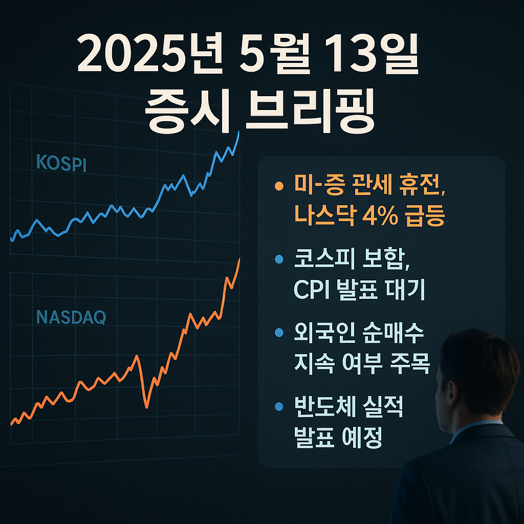 이 글은 투자 조언이 아닌 시장 동향 분석 정보입니다. 5월 12~13일 국내외 증시는 미국과 중국의 관세 협상 진전 소식과 주요 경제지표 발표를 앞두고 큰 변동성을 보였습니다. 미국 증시는 미·중 ‘관세 인하 합의’ 소식에 랠리했고, 나스닥은 4%대 급등세를 기록했습니다. 반면, 국내 증시는 관세 인하 기대감을 어느 정도 반영한 뒤 숨고르기 양상을 보였고, 코스피는 제한적 상승에 그쳤습니다. 이제 국내외 증시의 상승·하락 요인과 주요 지표, 기술적 분석 등을 단계별로 짚어보겠습니다.