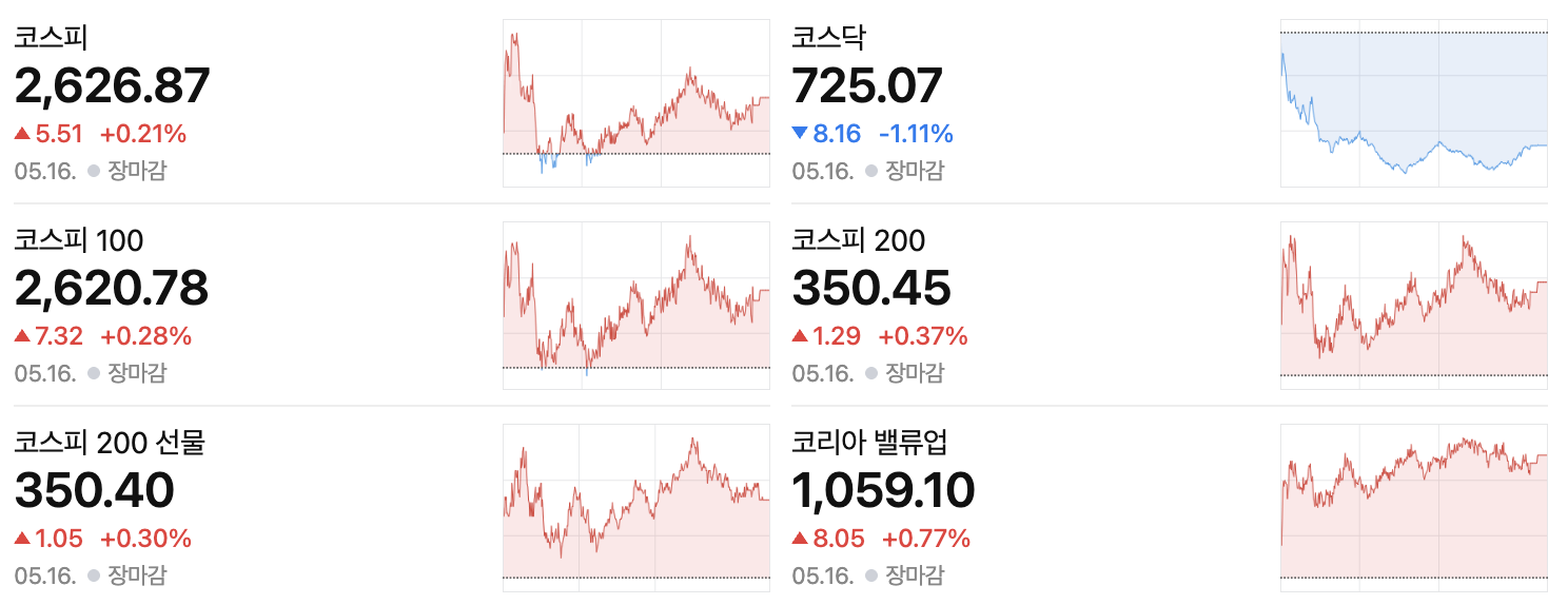 국내 증시 역시 암호화폐 투자심리에 영향을 줍니다. 앞서 언급했듯 5월 16일 코스피는 소폭 상승한 반면 코스닥은 하락하여 대형주와 성장주의 온도차를 보였습니다.