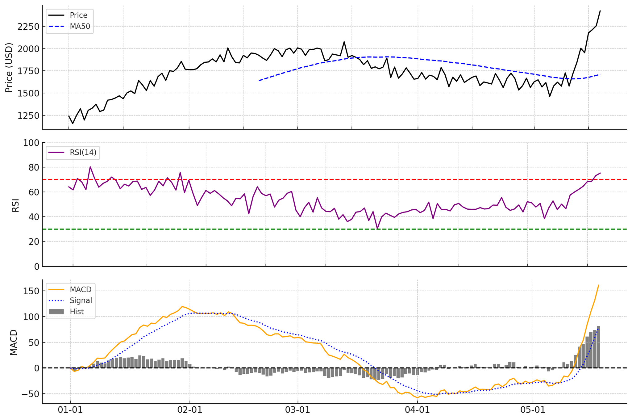 이더리움 가격은 4월까지 비교적 제한된 범위에서 등락하다가 5월 초 강력한 거래량을 수반하며 중요한 저항선인 2,400달러를 돌파했습니다. 이는 3월 이후 처음 있는 일로, 기술적으로는 추세 전환의 신호로 해석됩니다. 단기간 급등한 탓에 현재 가격은 50일 이동평균선 대비 크게 상승한 상태이며, 이격도가 상당합니다. 이러한 이격도 확대는 과열 신호일 수 있으나 강한 상승 초기 국면에서는 오히려 추격 매수를 부를 수도 있습니다.