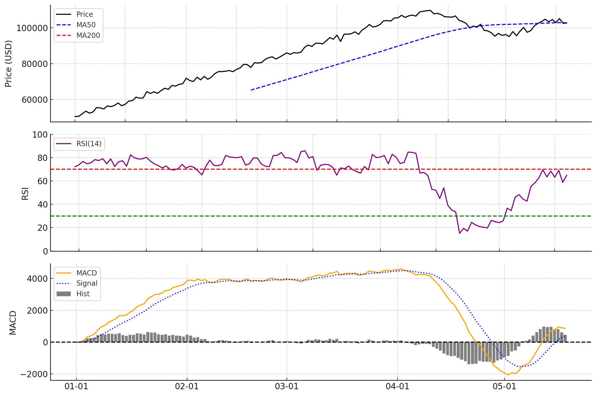 차트를 보면 비트코인 가격은 단기 조정에도 불구하고 50일 이동평균선(MA50)을 상회하며 중기 상승추세를 유지하고 있습니다. 50일선을 지속적으로 위에서 유지하면 투자자들의 평균 단가 대비 수익구간에 있는 주소가 많다는 뜻으로 지지력이 강할 수 있습니다. 다만 과거 급등 이후인 4월 말에 한때 가격이 급락하면서 RSI 지표가 30 이하로 내려갔던 구간이 관찰되는데, 이는 과매도 국면을 시사하며 해당 구간에서 기술적 반등이 발생했습니다. 현재 RSI(14)는 약 60~70 선으로 과열과 중립 사이에 위치해 있습니다. RSI(상대강도지수)가 70을 넘으면 과매수로 보고 30 미만이면 과매도로 보는데, 비트코인은 아직 과매수 임계점에 도달하지 않아 추가 상승 여력이 있음을 시사합니다.