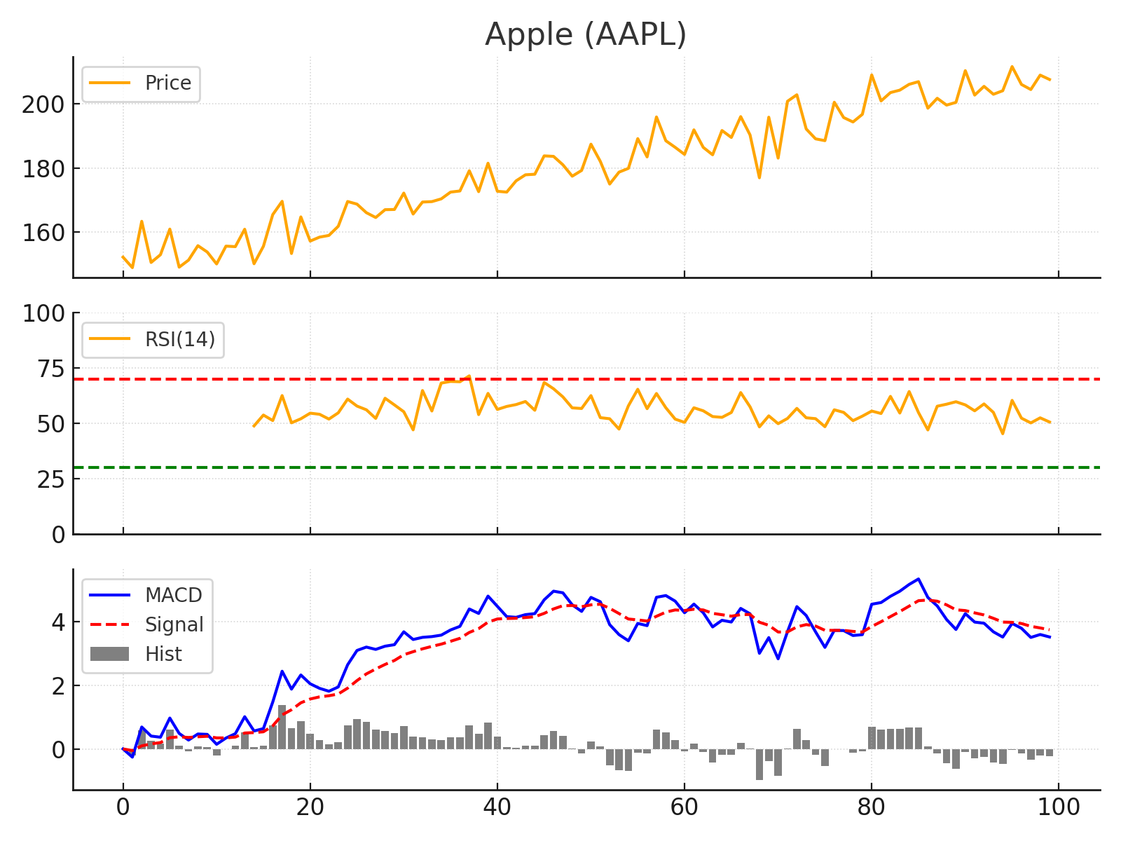 기술적 분석: 현재 애플의 주가는 단기 이동평균선 위에서 안정적으로 움직이고 있으며, 큰 추세에서는 우상향 기조를 유지하고 있습니다. RSI(14)는 약 55 수준으로 과열 없이 건강한 상승세임을 나타내고 있습니다. 이는 최근 주가 조정으로 RSI가 잠시 70 부근에서 내려온 것으로, 추가 상승을 위한 에너지 충전 국면으로 볼 수 있습니다. MACD 지표를 보면 지난달 양(+)의 영역으로 돌아선 이후 꾸준히 신호선 위를 유지중이며, 히스토그램도 거의 0선 부근에서 작은 양수를 이어가고 있습니다. 이는 애플 주가의 상승 모멘텀이 완만하지만 유효함을 시사합니다. 다만 최근 며칠 새 MACD 바가 다소 줄어든 만큼, 단기적으로는 주가 상승 탄력이 둔화될 수 있겠습니다. 투자자는 $200 선이 심리적 저항선으로 작용할 수 있으므로 이 부근에서의 거래량 및 가격 반응을 체크하고, 조정 시 $190 전후 지지력을 확인하며 접근하는 전략이 좋겠습니다.