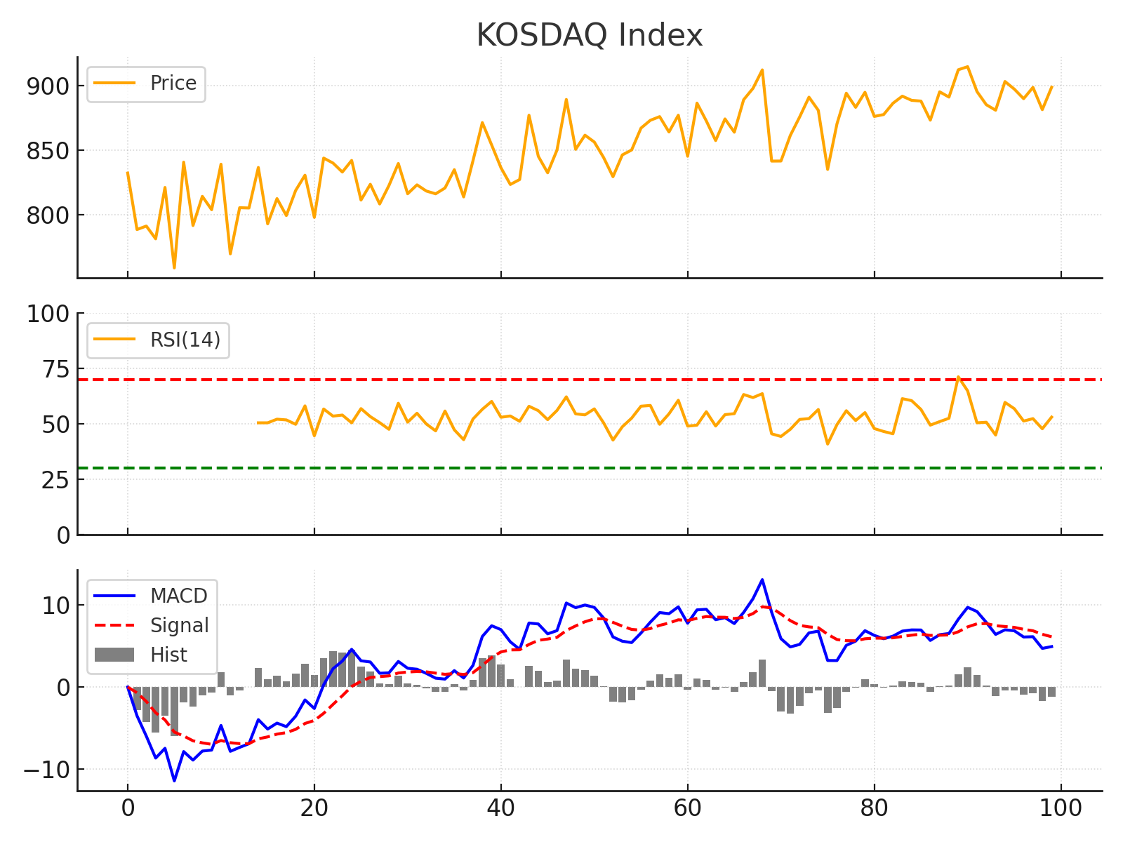 코스닥 일간 차트 – 코스닥 지수도 전반적인 상승 추세 속에 변동성이 다소 큰 모습입니다. RSI는 50 안팎에서 등락하며 뚜렷한 과매수·과매도 신호 없이 중립권에 머물렀습니다. 이는 코스닥 시장의 투자 심리가 보합세임을 보여줍니다. MACD 지표를 보면 최근 히스토그램(막대)이 0선 부근에서 횡보하고, MACD선과 신호선이 교차하는 모습이 반복되어 뚜렷한 방향성 없이 등락을 거듭하는 상황입니다. 즉, 중소형 기술주 중심의 코스닥은 단기 재료에 민감하게 반응하며 큰 추세 없이 개별 종목장세가 전개되고 있습니다.