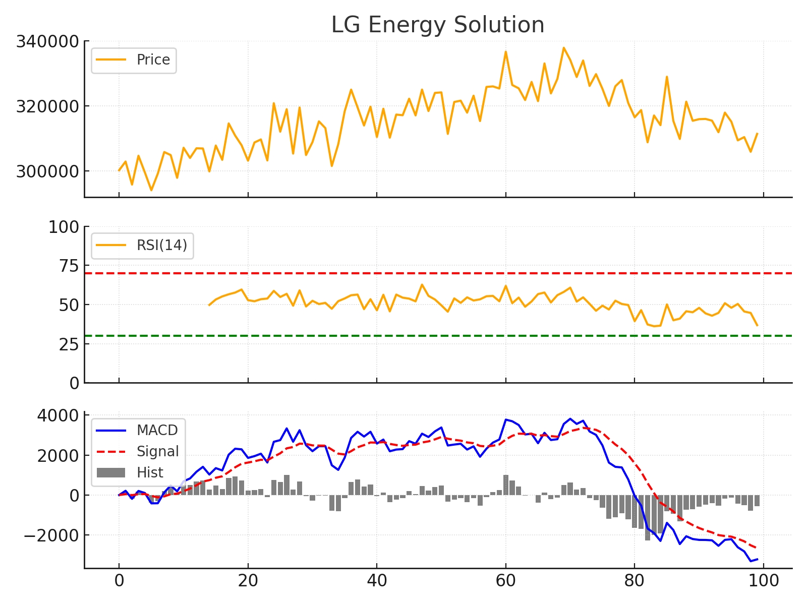 기술적 분석: 차트를 살펴보면 LG에너지솔루션 주가는 4월 중순 고점(약 34만 원대)을 형성한 뒤 조정 국면으로 돌아서 현재 30만 원 부근까지 내려와 있습니다. RSI 지표는 40대 중반으로 과매도에 가까운 약세권에 진입하여, 단기 낙폭 과대에 따른 기술적 반등 가능성을 시사합니다. MACD 지표도 한동안 음(-)의 영역에서 머물며 하락 추세를 반영했고, MACD선이 신호선 아래로 계속 내려가 있다가 최근 그 간격이 다소 좁아지는 모습이 포착됩니다. 이는 하락 추세가 점차 완화되고 있음을 의미하며, 조만간 매도세 힘이 약해질 수 있다는 신호로 해석할 수 있습니다. 다만 추세 전환을 위해선 거래량 동반된 강한 반등이 필요하므로, 신규 진입은 보수적으로 접근하면서 주요 지지선인 29만 원대 방어 여부를 지켜보는 것이 좋겠습니다.