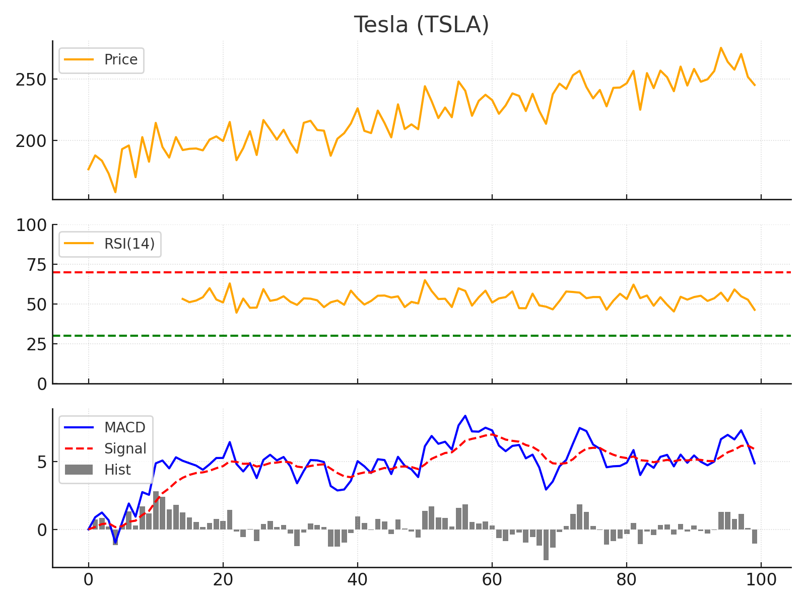 기술적 분석: 테슬라의 차트를 보면 주가가 단기간에 200달러 초반에서 250달러 중반까지 크게 뛰었다가 다시 조정을 받는 넓은 박스권 변동을 보이고 있습니다. RSI 지표는 50 안팎을 오가며 뚜렷한 방향성을 보여주지 못하고 있습니다. 이는 테슬라 주가에 모멘텀이 중립적임을 의미하며, 투자자들이 관망하며 눈치보는 장세라는 해석이 가능합니다. MACD 지표를 보면 올해 들어 MACD선과 신호선이 몇 차례 교차하는 등 추세 변화가 잦았고, 최근에는 약간 플러스 영역에 머물러 있으나 그 거리도 크지 않아 뚜렷한 추세 형성을 못하고 있습니다. 다만 주가가 250달러 선 근처에서 몇 차례 저항을 받다가 내려온 점으로 미뤄 $250 부근이 단기 저항선으로 작용하고 있고, $210~220 부근이 지지대로 인식되고 있습니다. 향후 테슬라 주가는 향후 실적 발표(자동차 마진율 등)과 머스크의 행보(예: 트위터 경영 관련)가 중요한 변수로 작용할 전망이며, 기술적으로는 이 범위 안에서 등락을 지속하다가 돌파 방향에 따라 추세가 결정될 것으로 보입니다.
