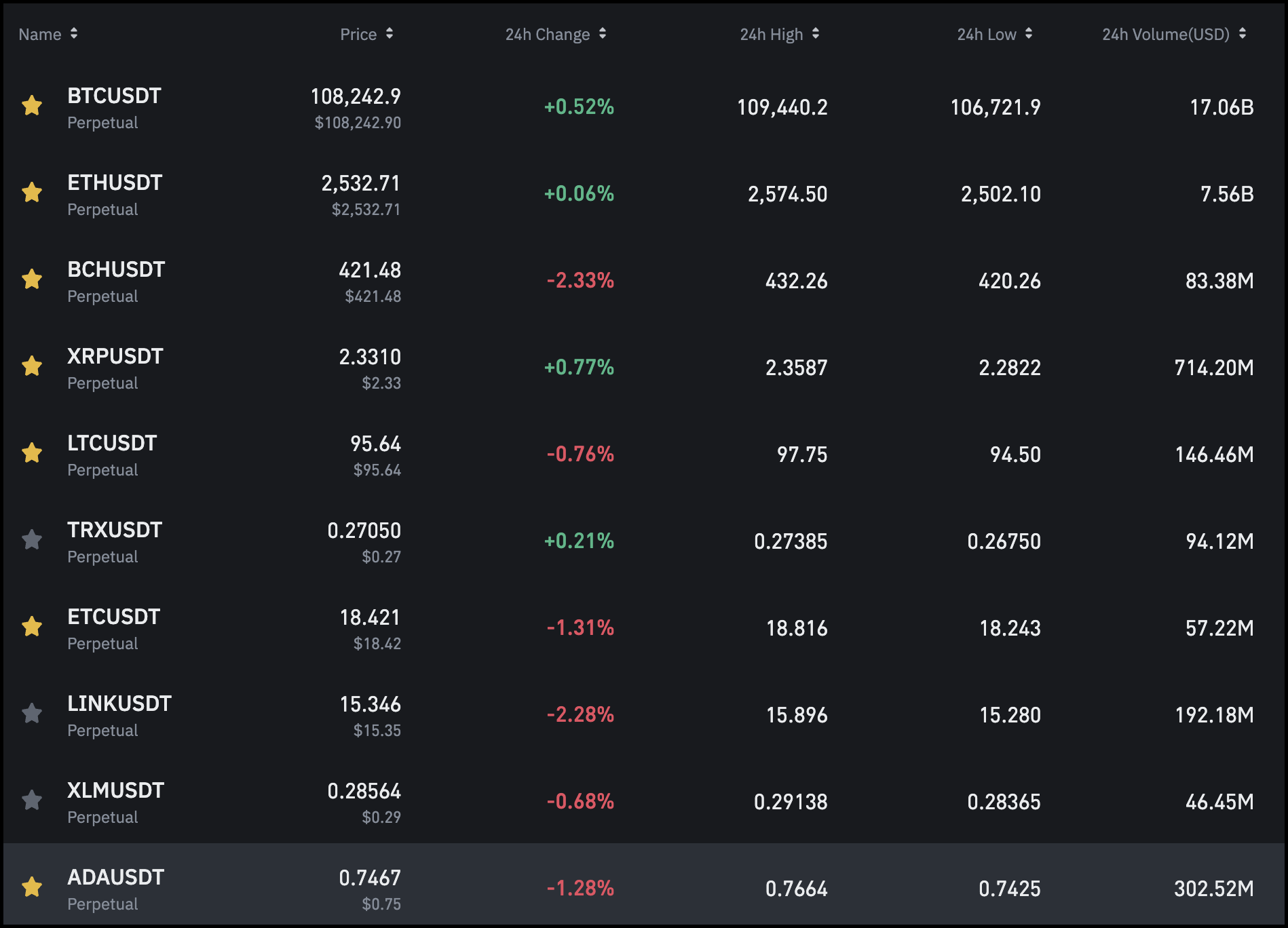 해외 거래소의 경우, 글로벌 1위인 바이낸스(Binance)는 여전히 압도적인 유동성을 자랑하며 24시간 거래량 수십조원대를 유지하고 있습니다. 바이낸스의 BTC 무기한 선물 상품의 일일 거래량만 17억 달러 (보유 미결제약정 17만 BTC 규모 상당) 이상으로, 이는 전 세계 투자자들이 가장 활발히 거래하는 시장임을 보여줍니다. 이더리움(ETH) 선물 역시 일 거래 70억 달러 이상 체결되며 비트코인 다음으로 큰 파생시장으로 자리잡았습니다.