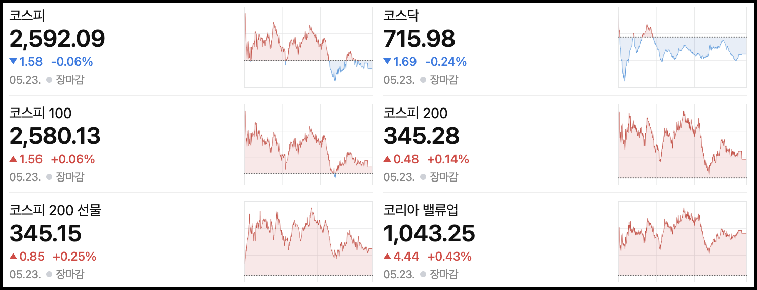 5월 23일 장마감 기준 국내 증시는 코스피 2,592.09(-0.06%), 코스닥 715.98(-0.24%) 등 전반적으로 보합권에 머물렀습니다. 주 후반 국내 증시는 트럼프 전 대통령의 관세 폭탄 예고 등 대외 변수로 큰 방향성 없이 혼조세로 마감했는데, 코스피200 선물(+0.25%) 등 일부 지표는 소폭 상승해 투자심리가 크게 나쁘지 않은 상태임을 시사했습니다. 한편 원/달러 환율은 1달러당 약 1,398원 수준으로 안정적이었고, 이는 원화 가치의 급격한 변동 없이 국내 코인 가격에 큰 영향이 없는 환경을 조성했습니다.