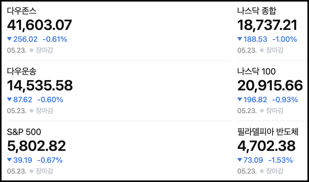 글로벌 금융시장에서는 5월 23일(현지시각) 뉴욕 증시의 주요 지수가 일제히 하락했습니다. 다우지수(-0.61%), 나스닥 종합(-1.00%), S&P500(-0.67%) 등 위험자산 전반에 투자심리 위축이 나타난 것은, 트럼프 미국 대통령(전 대통령)의 “EU산 제품에 50% 관세 부과” 위협 발언 때문으로 풀이됩니다. 실제로 해당 소식이 전해지자 유럽 주요 명품기업 주가가 3~4% 급락하는 등 글로벌 증시에 충격을 주었고, 비트코인도 하루 새 2~3% 하락하며 11만 달러 선이 무너지기도 했습니다. 다만 미국-인도의 무역 합의 임박 소식 등 일부 긍정적인 무역뉴스가 뒤따르며 다음 날 증시 선물과 투자심리가 안정을 찾는 모습이었고, 비트코인은 단기 급락을 딛고 곧바로 10만 달러 후반대를 회복하는 탄력도 보였습니다.