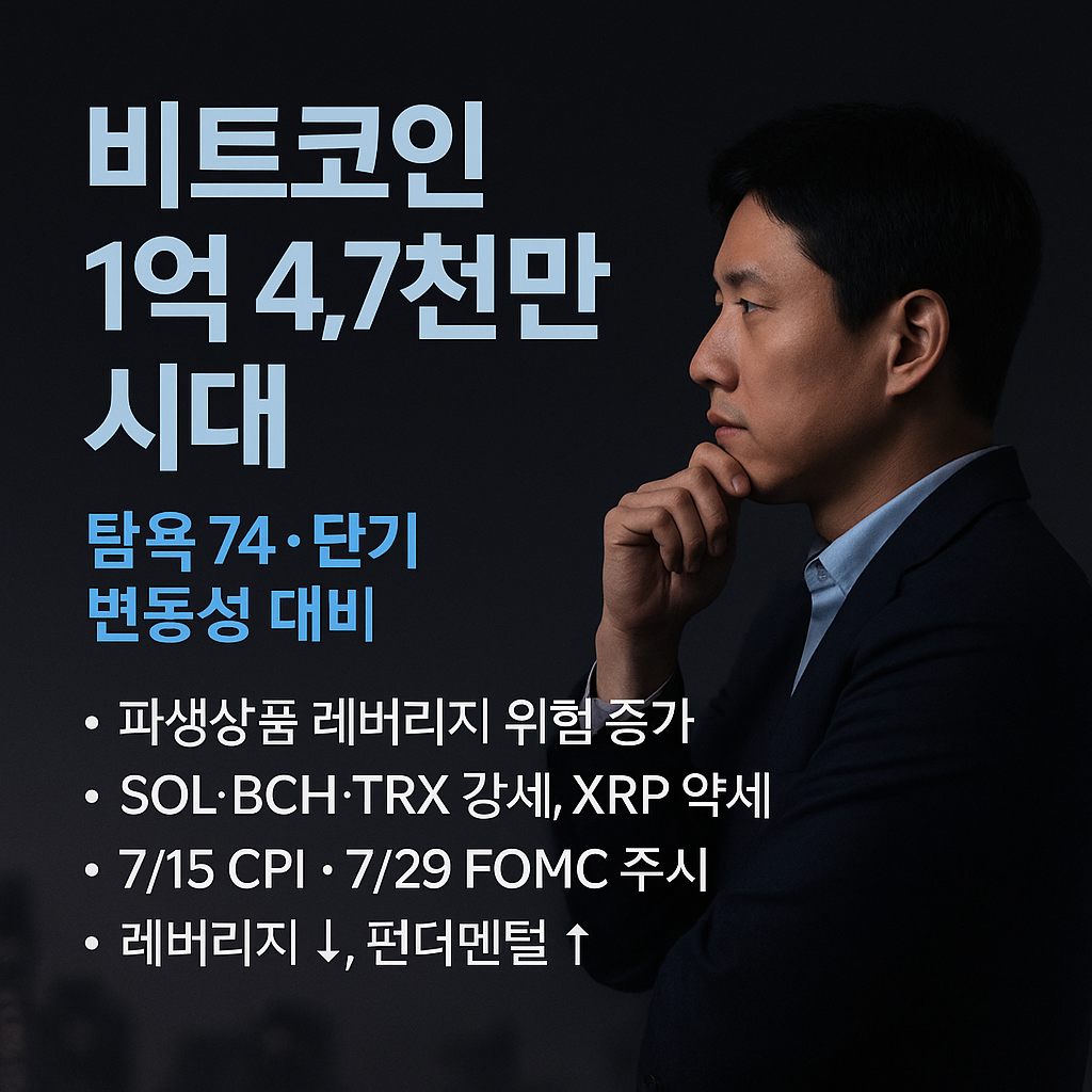 2025년 6월 27일, 현재 암호화폐 시장은 매우 흥미로운 역설을 보여주고 있습니다. 비트코인(BTC)은 개당 1억 4,734만 5,000원(업비트 기준)이라는 상징적인 가격대에 견고하게 서 있으며, 이는 거시 경제 자산으로서의 지위가 강화되고 있음을 증명합니다. 그러나 이 강력한 표면 아래에는 투자자들의 '탐욕(Greed)' 심리, 파생상품 시장에서 울리는 경고음, 그리고 주요 알트코인들의 운명이 극명하게 엇갈리는 복잡한 상호작용이 숨어있습니다. 본 보고서는 이러한 상충하는 신호들을 면밀히 해부하여, 앞으로 시장이 나아갈 길에 대한 명확하고 데이터에 기반한 통찰을 제공하고자 합니다.