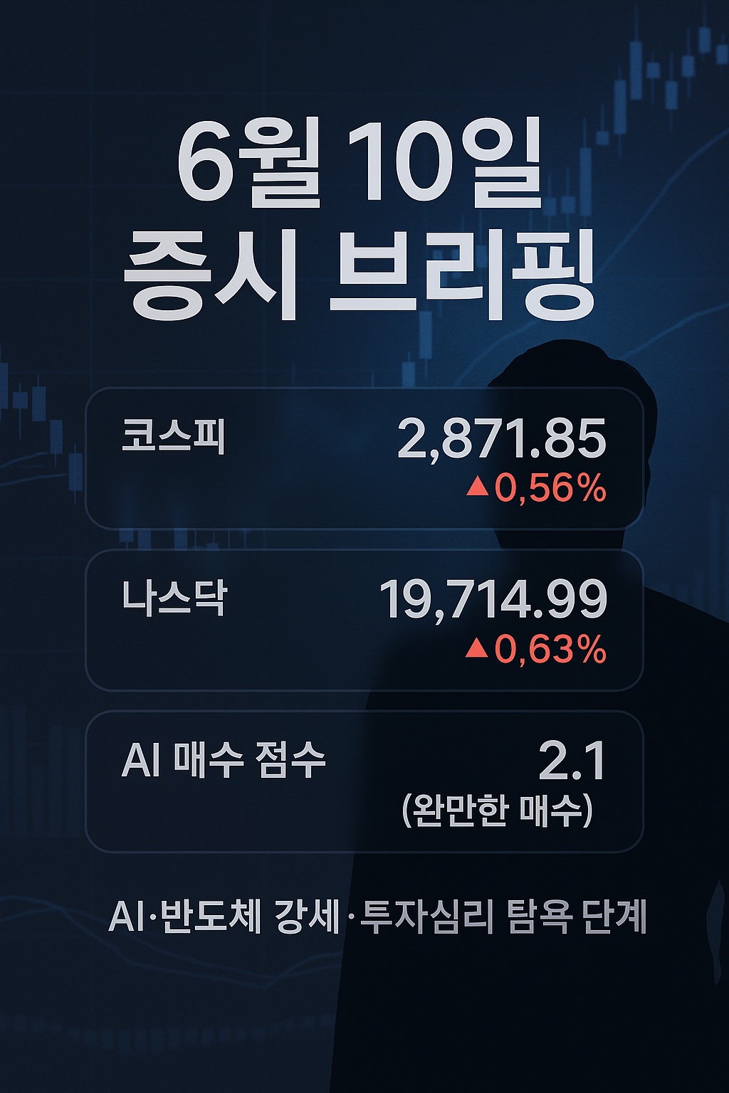 요약: 6월 10일 증시는 코스피·미국 주요지수 모두 상승 마감했으며, AI·기술주 강세가 두드러졌습니다. 기술적·기본적 분석과 AI 뉴스 기반 매수추천 점수(2.1)를 종합하면 현 구간은 온건한 매수 기회로 판단됩니다. 그러나 글로벌 경기 불확실성과 고평가 부담도 커진 만큼, 신중한 분할 매수와 중장기적인 펀더멘털 관점의 접근이 요구됩니다.