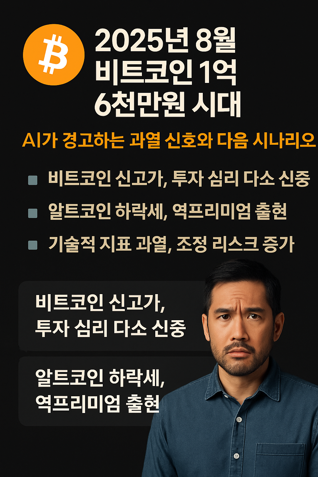 지금까지의 분석을 종합하면, 2025년 8월의 암호화폐 시장은 '비트코인의 과열된 독주'와 '알트코인의 불안한 조정'이라는 모순된 상황에 놓여 있습니다. 기술적 지표는 비트코인의 피로감을, 파생상품 데이터는 과도한 레버리지의 위험을 경고하고 있으며, 역프리미엄 현상은 국내 시장의 상대적 약세를 드러냅니다.