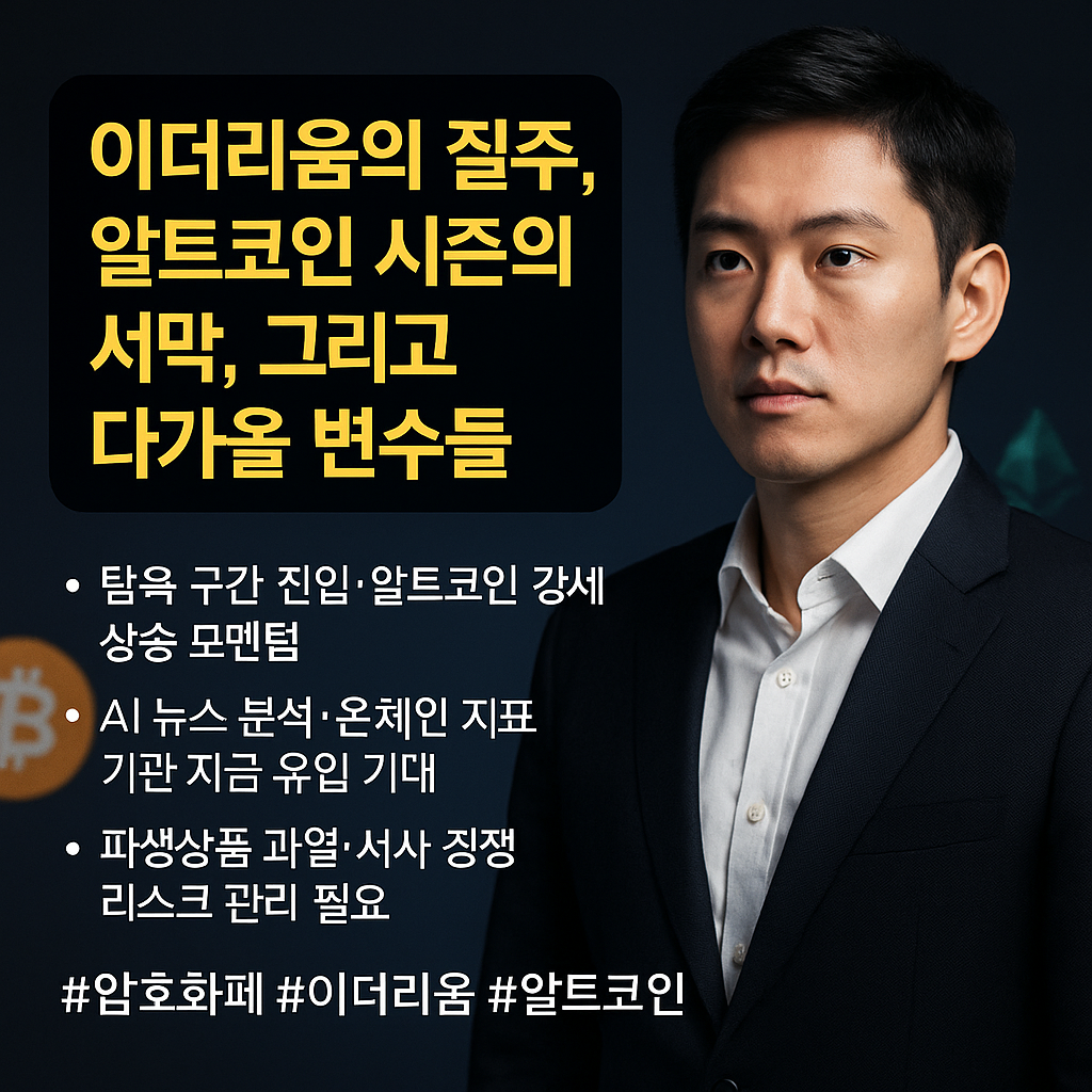 2025년 8월 현재, 암호화폐 시장은 '레버리지에 기반한 탐욕' 상태에 있습니다. 이더리움을 필두로 한 강력한 내러티브가 알트코인 시장의 상승을 견인하고 있지만, 파생상품 시장의 과도한 레버리지는 시장을 외부 충격에 취약하게 만듭니다. 비트코인은 변동성을 줄이고 제도권 자산으로 자리매김하며 생태계의 안정적인 닻 역할을 하고 있으며, 진정한 의미의 '크립토 리스크'와 그에 따른 고수익의 기회는 알트코인 생태계로 이전되었습니다.