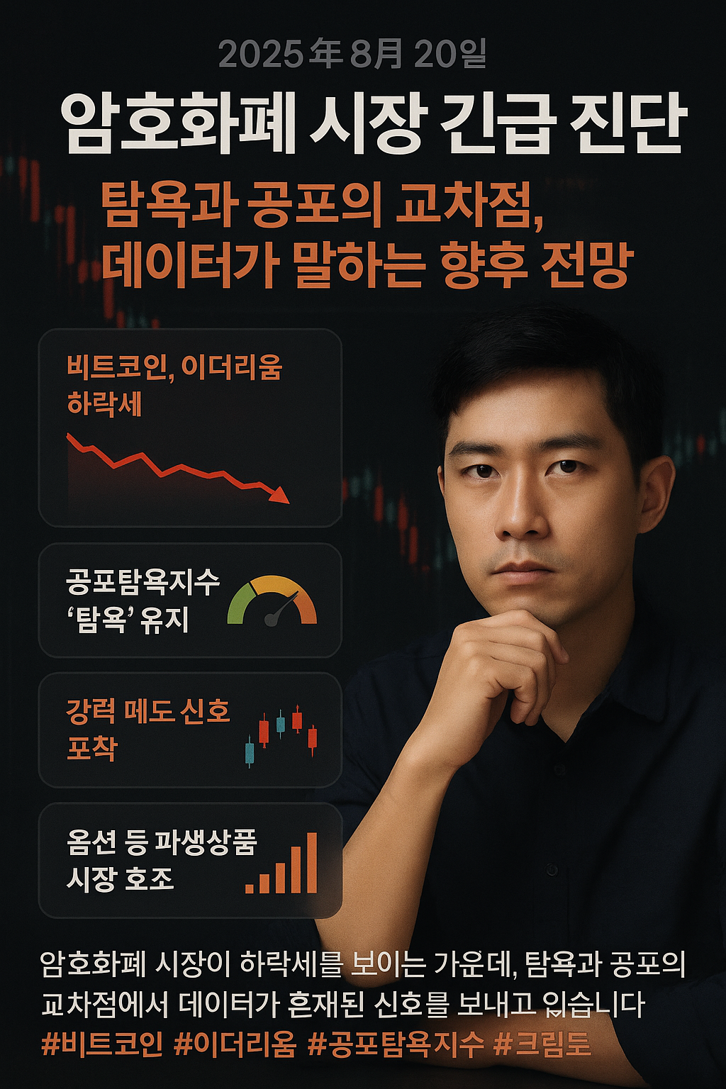2025년 8월 20일 오전 7시, 암호화폐 시장은 전반적인 하락세를 보이며 붉은색 파도로 뒤덮였습니다. 투자자들의 불안감이 고조되는 가운데, 표면적인 가격 움직임 너머에 숨겨진 데이터들은 복합적이고 때로는 상충하는 신호를 보내오고 있습니다. 본 컬럼에서는 현재 시장 상황을 다각적으로 분석하여, 이 혼란 속에서 우리가 무엇을 읽어내야 하는지, 그리고 앞으로의 시장은 어떤 방향으로 흘러갈 가능성이 높은지에 대한 심도 깊은 통찰을 제공하고자 합니다. 단순한 가격 등락을 넘어, 기술적 지표, 파생상품 시장의 흐름, 그리고 온체인 데이터가 가리키는 '보이지 않는 손'의 움직임을 추적해 보겠습니다.