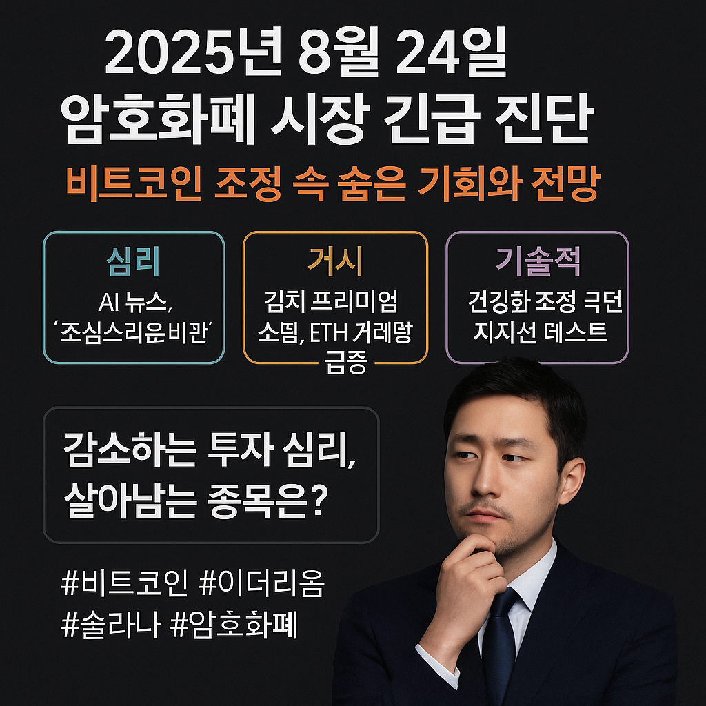 | 2025년 8월 25일 암호화폐 시장 심층 분석: 비트코인 조정과 이더리움의 독주, 데이터가 말하는 다음 행보는? (1) | 2025.08.25 |