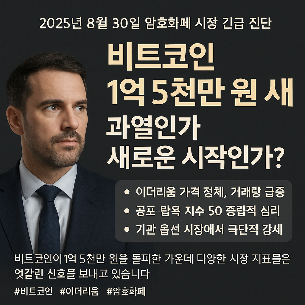 2025년 8월 30일 암호화폐 시장 긴급 진단: 비트코인 1억 5천만 원 시대, 과열인가 새로운 시작인가? (데이터 심층 분석)