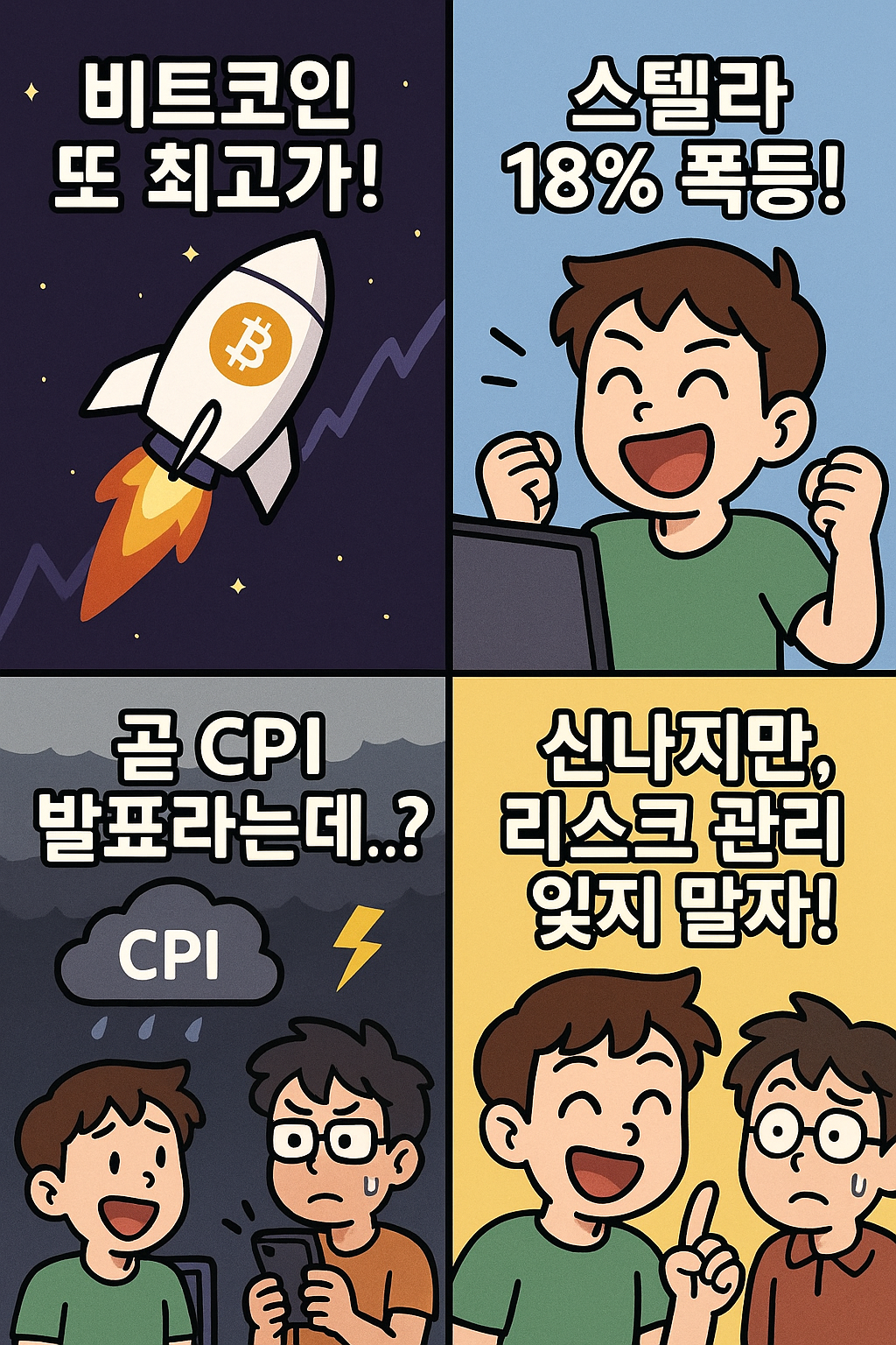 비트코인이 1억6천만 원을 돌파하고, 스텔라(XLM)가 하루 18% 급등했습니다. 축포가 터지는 듯한 강세장이지만 곧 발표될 미국 CPI 지표가 시장을 시험대에 올려놓고 있죠.