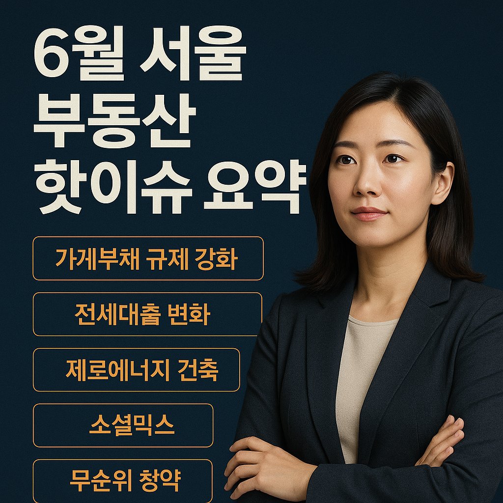 2025년 6월 서울 부동산 시장의 뜨거운 이슈들을 총정리합니다. 가계부채 규제 강화, 스트레스 DSR 3단계, 전세대출 변화, 제로에너지 건축, 소셜믹스 정책, 무순위 청약까지! 당신의 내 집 마련과 자산 관리에 필수적인 정보를 사례 중심으로 쉽고 명확하게 알려드립니다.
