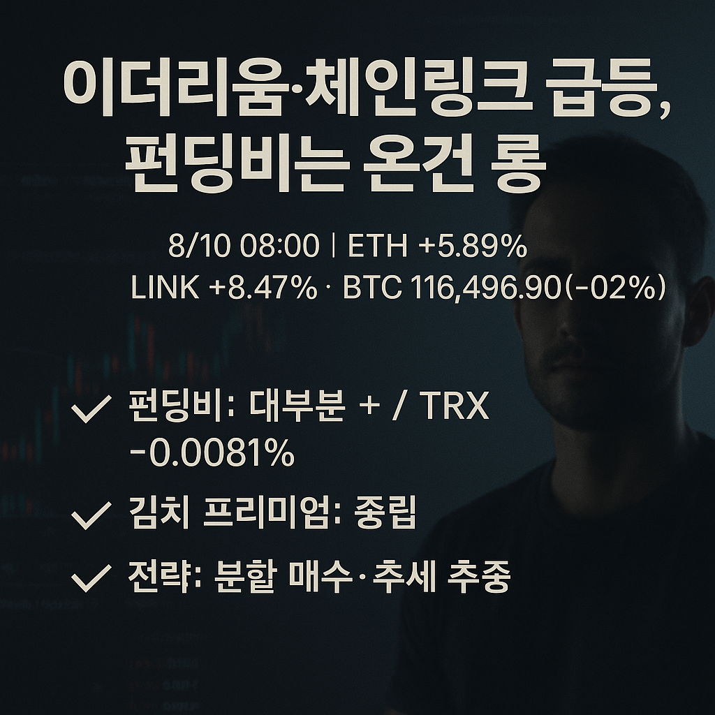 한국시간 8월 10일 08:00 현재, ETH(+5.89%)·LINK(+8.47%)가 선도 상승, 펀딩비는 대부분 플러스(롱 우위), TRX만 음수(-0.0081%)로 역행 중. 김치 프리미엄은 거의 중립(대략 +0.05% 내외)이며, 뉴스 기반 매수 추천 점수는 완만한 플러스권을 이어갑니다.
